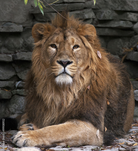 © andamanec, Naklejka premium Marzycielski wygląd lwa azjatyckiego jesienią opadłych liści, leżącego na skalistym tle. Król zwierząt, największy kot świata. Najbardziej niebezpieczny i potężny drapieżnik świata. Dzikie piękno natury.