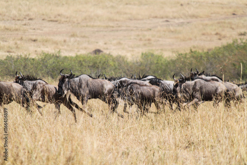 © 國樹潘, Naklejka premium Masai Mara teems with diverse wildlife: cheetahs, giraffes, ostriches, gazelles, hippos, crocodiles, storks, and wildebeest roam the vast landscapes