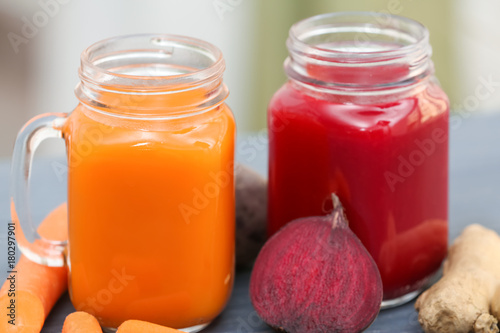 © Africa Studio, Fototapeta premium Mason jars with various fresh vegetable juices and ingredients on table