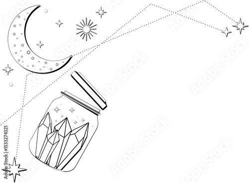 Obraz premium Mason-style jar with lid is floating in line art with crystals and stars on...