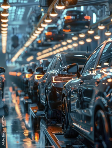 © Johannes, Fototapeta premium Mass production assembly line of modern cars in a busy factory, generative ai