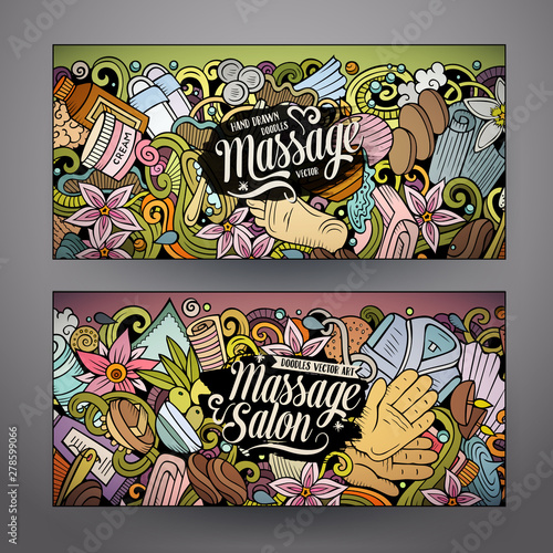 Obraz premium Massage hand drawn doodle banners set. Cartoon detailed flyers.
