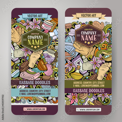 Obraz premium Massage hand drawn doodle banners set. Cartoon detailed flyers.