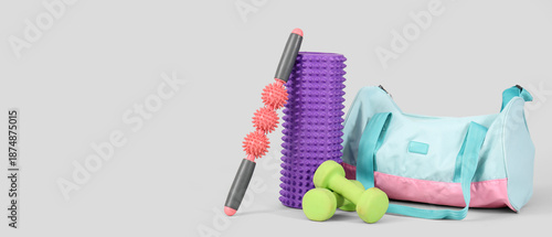 Obraz premium Massage rollers with dumbbells and fitness bag on light background