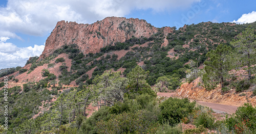 Fototapeta premium Massif de l'Esterel, a volcanic mountain range on the Mediterranean Sea coast on the French Riviera, located near Cannes on the east and Saint-Rafael on the west, France