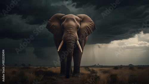 © Pramata, Obraz premium Massive African elephant standing on dry savanna under dark dramatic stormy sky. Nature concept