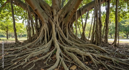 Obraz premium Massive banyan tree roots spread across ground