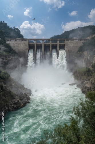 © Tas, Fototapeta premium Massive concrete dam releasing powerful water cascades into a rugged canyon with lush green foliage and a bright blue sky overhead