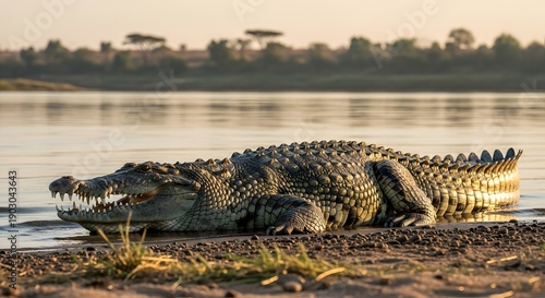 © Ahmad Nurhilal , Fototapeta premium Massive Crocodile Resting by the Water Edge at Sunset
