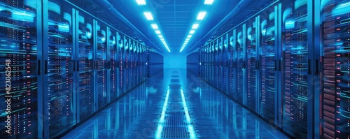 Fototapeta premium Massive data servers, glowing blue lights, hightech design, vibrant colors,...