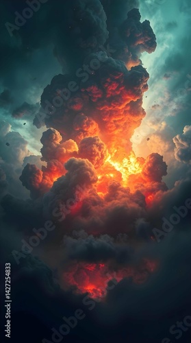 Obraz premium Massive Fiery Explosion with Dramatic Dark Teal Clouds Art