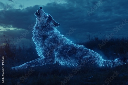 Obraz premium Massive glowing wolf howling into the night under a starry sky, surrounded by...