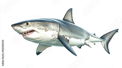 © 69, Fototapeta premium Massive great white shark isolated on a clean white background, displaying its streamlined body and sharp, predatory features