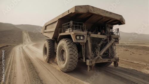 © Amanah, Obraz premium Massive mining truck driving on a dusty road in a desert landscape.