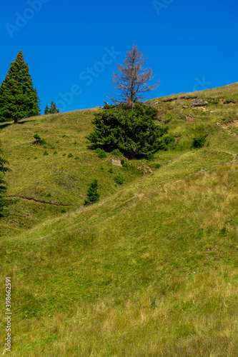 © Oana, Obraz premium Massive pine tree, half dried, half green, in Bucegi national park, Carpathian mountains, Romania
