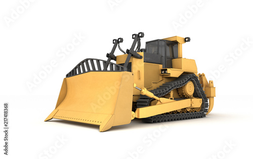 © Evgenii Iakovenko, Fototapeta premium Massive powerful yellow hydraulic bulldozer isolated on white background. 3D illustration. Side view. Wide angle. Perspective