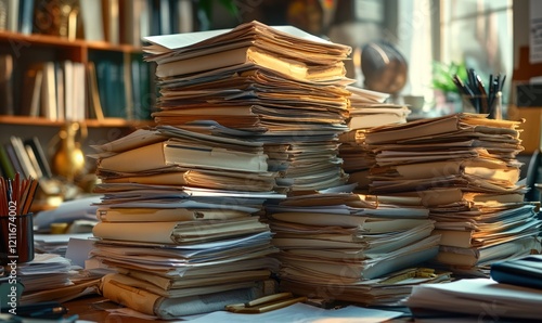 © Ali, Obraz premium Massive stacks of disorganized papers and files.