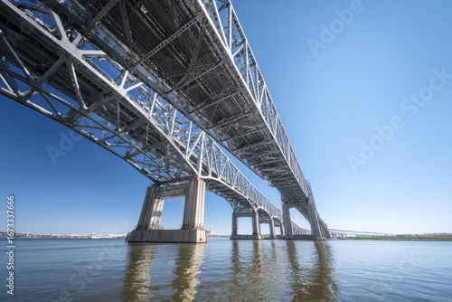 Fototapeta premium Massive steel truss bridge spans a calm river under a bright blue sky, viewed from below. Industrial architecture and structural detail highlight engineering design. ai generative