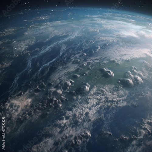 © Nazuna, Fototapeta premium Massive tidal wave engulfing Earth seen from space, cinematic, epic scale, detailed water simulation, dramatic lighting, planet Earth visible, storm clouds.