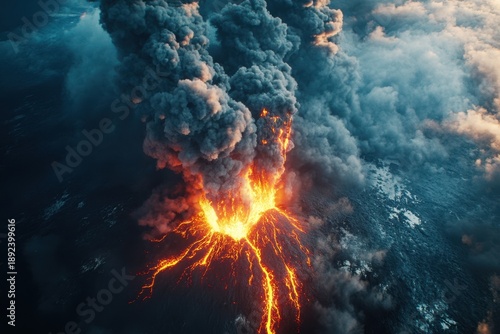 Obraz premium Massive volcanic eruption creates thick smoke and flowing lava over landscapes