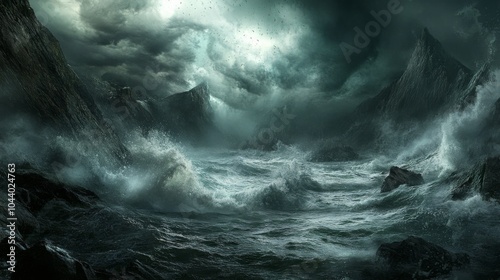 Fototapeta premium Massive waves crash violently against the jagged rocks amid an approaching...