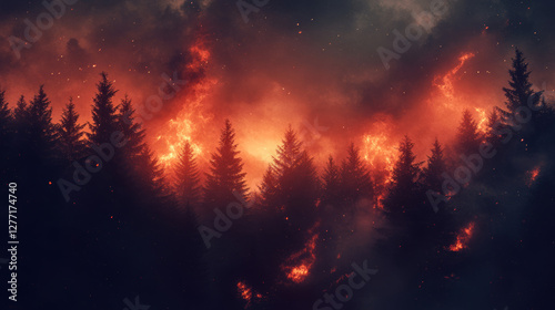 Naklejka premium Massive wildfire engulfing a dense forest with thick smoke and blazing flames, highlighting environmental destruction and climate crisis.