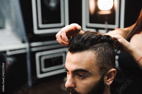 Fototapeta premium Master cuts hair and beard of men in the barbershop, hairdresser makes hairstyle for a young man