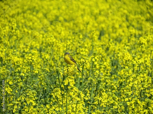 © Serhii, Fototapeta premium Master of camouflage. Yellow wagtail hidden among yellow flowers