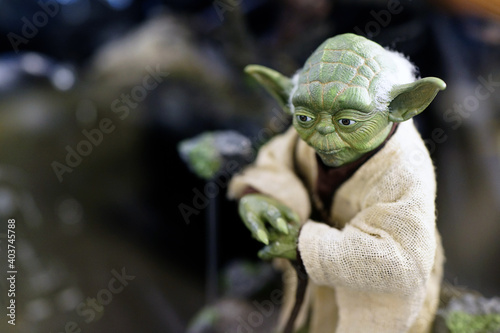 © ltyuan, Naklejka premium Master Yoda fictional character figures in Ximending Mall, Taipei. Yoda serves as the Grand Master of the Jedi Order and as a high-ranking general of Clone Troopers. TAIPEI, TAIWAN - JUNE 26, 2018.