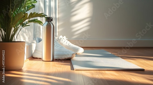 Naklejka premium mata do jogi, buty sportowe, butelka ze stali nierdzewnej, styl minimalistyczny, sportowe akcesoria, podłoga drewniana, światło naturalne, sport, zdrowy styl życia, siłownia, trening, joggers, akcesor