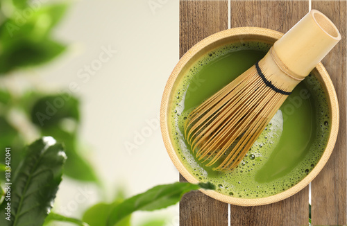 Fototapeta premium Matcha tea and whisk in cup on wooden table against green leaves