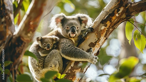 © NASIR, Fototapeta premium Maternal koala resting her young on her back atop a tree