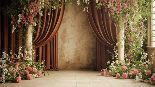 Fototapeta premium Maternity or wedding vintage backdrop with rich brown drapery, floral columns adorned with pink roses and greenery, and a distressed textured wall, creating a timeless and elegant event.