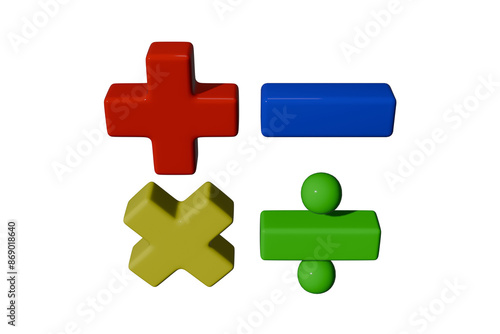 Fototapeta premium Math symbols 3D render, a red plus, blue minus, yellow multiply, green divide