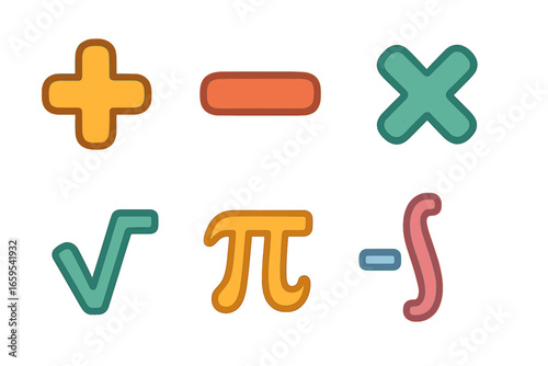 © Svitlana, Fototapeta premium Math Symbols Grid. Flat vector mini-illustrations formula math symbols in colors children's illustrations: plus sign, minus sign,