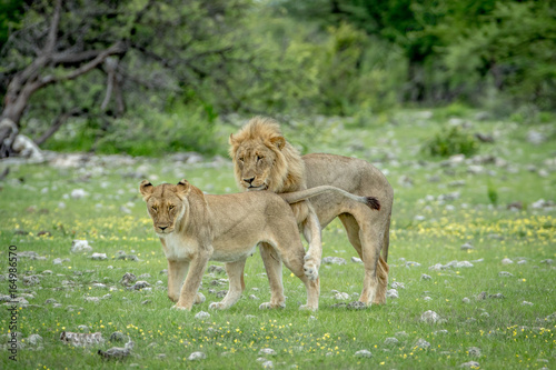 © simoneemanphoto, Obraz premium Mating couple of Lions in the grass.