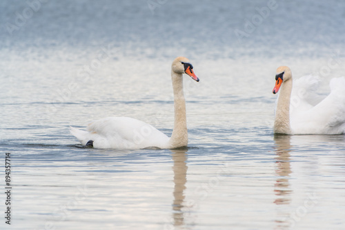 Fototapeta premium Mating games of a pair of white swans. Swans swimming on the water in nature. Valentine's Day background