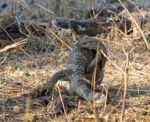 Naklejka premium Mating monitor lizards isolated under a tree in the African bush
