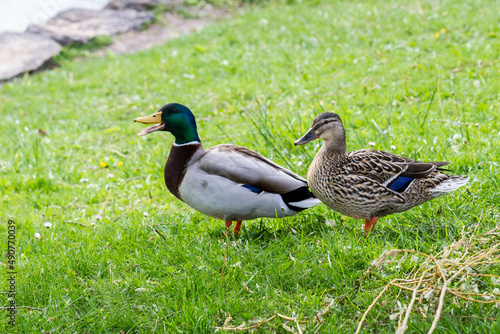 Fototapeta premium Mating pair of Mallard ducks on grass
