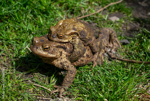 © Remigiusz Góra, Fototapeta premium mating toads in spring, a pair of male and female toads on the grass