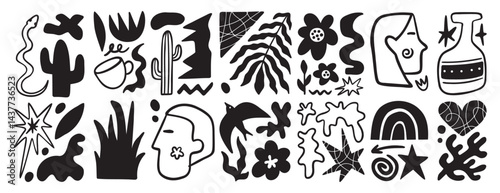 Naklejka premium Matisse geometric doodle set organic shapes. Abstract floral naive art. Botanic elements boho aesthetics