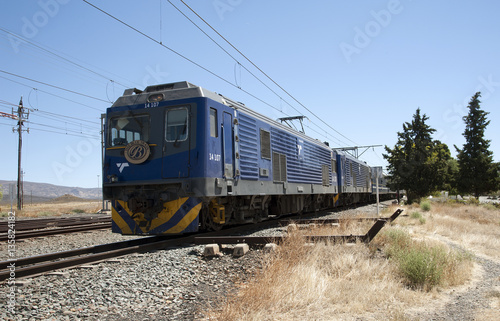 © petert2, Fototapeta premium Matjiesfontein w regionie Central Karoo na zachodnim przylądku RPA. Luksusowy niebieski pociąg, który jedzie z Kapsztadu do Pretorii