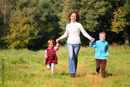 © Pavel Losevsky, Obraz premium Matka z dziećmi biegnie w drewnie, widok z przodu