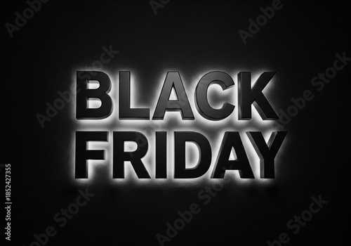 Obraz premium Matte black 3D text Black Friday emerging from wall with rim lighting.