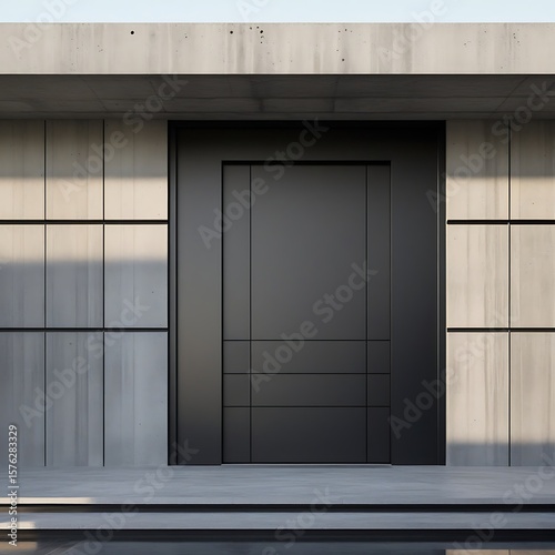 © MDFUAD, Fototapeta premium Matte-black front door on a modern concrete house, large rectangular shape with no handles visible, set within a seamless grey wall with horizontal lines, shot in clean daylight.