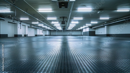 © Aeman, Naklejka premium Matte finish rubber tiles in a spacious garage, subtly reflecting fluorescent lights