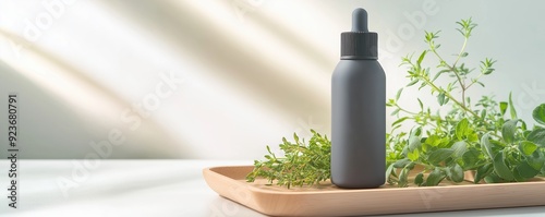 © Nisit, Fototapeta premium Matte grey dropper bottle with a sleek design, placed on a wooden tray with fresh herbs and soft natural light.