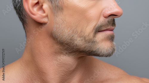 Fototapeta premium Matte male jawline with crisp texture detail, closeup of mature man with stubble beard, healthy skin, neutral grey background, confident expression