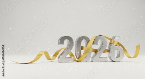 Fototapeta premium Matte silver 2026 numbers wrapped in a sparkling gold ribbon on a subtle,...