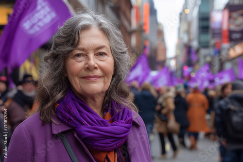 Fototapeta premium Mature adult woman at a feminist demonstration, Women's Day in purple colors, streets filled with people fighting for rights and equality